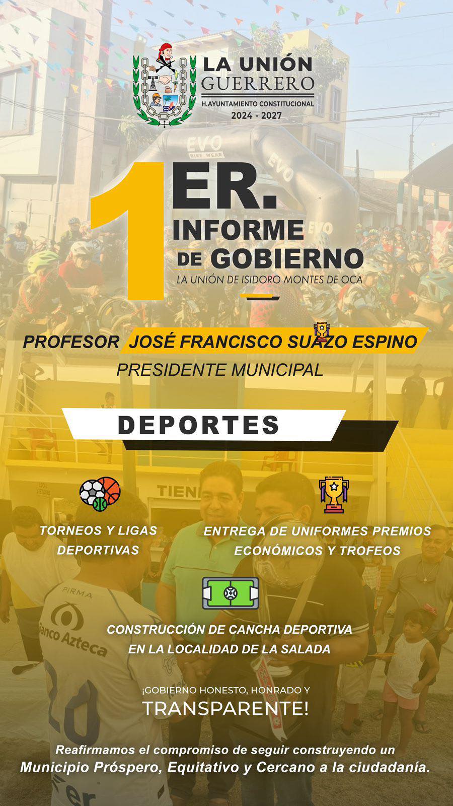 La Unión, Gro., 13 septiembre 2025.- El presidente municipal de La Unión, José Francisco Suazo Espino reafirmó su compromiso con el impulso al deporte, destacando que esta actividad no solo representa salud y disciplina para los jóvenes, sino también un espacio de integración familiar y comunitaria.