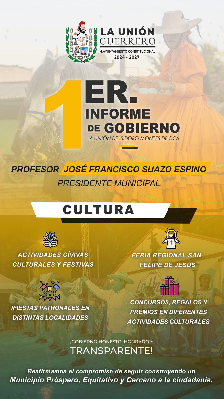 El presidente municipal, José Francisco Suazo Espino, informó que durante su Primer Informe de Gobierno, a celebrarse este lunes 15 de septiembre, dará a conocer los avances y logros en materia cultural, destacando que impulsar estas actividades significa fortalecer el corazón del municipio.
