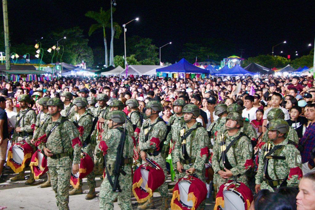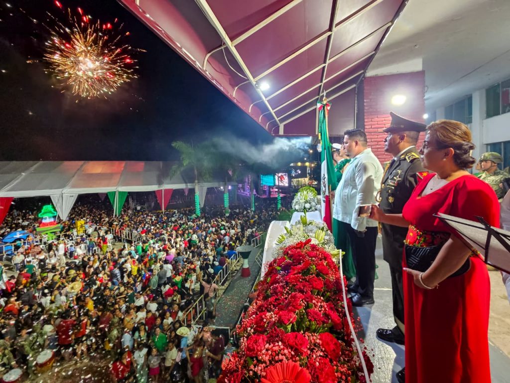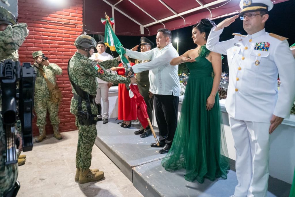 Una vez que Manuel Esquivel encendió el pebetero con el fuego patrio en la explanada municipal, junto a su esposa y Presidenta Honoraria del DIF Municipal, Dulce Citlali Rodríguez Rodríguez, como del jefe de Estado Mayor de la XVI Zona Naval, Ángel Julián Melo Moya; el Comandante del 82º Batallón de Infantería, Carlos Cruz Aguirre; y la Diputada Local, Itzé Camacho, subieron al balcón presidencial para dar inicio al acto del Grito de Independencia.