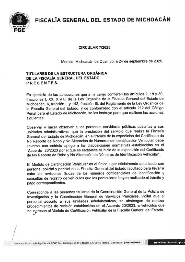 Morelia, Michoacán, 30 de septiembre de 2025.- El Fiscal General del estado de Michoacán, Carlos Torres Piña, emitió la circular 7/2025, con la cual se prohíben las revisiones de los números de identificación de vehículos fuera de instalaciones oficiales.