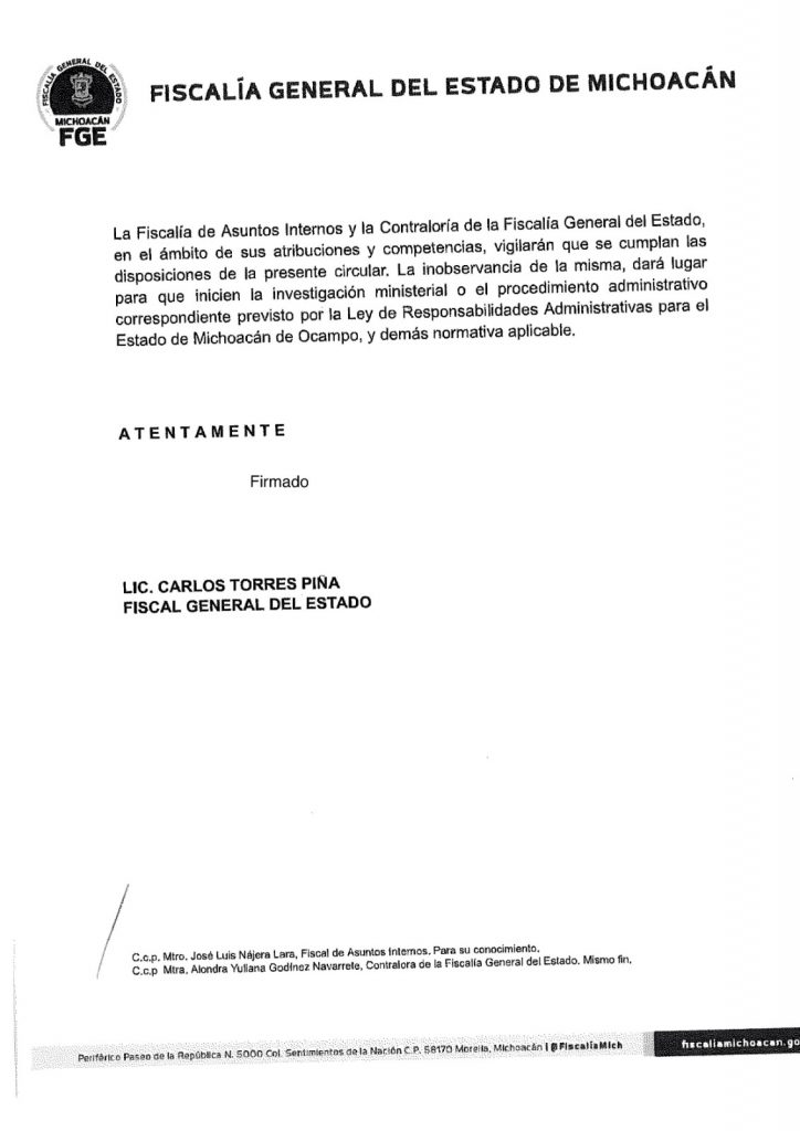 Asimismo, el Fiscal General puntualizó que la Fiscalía de Asuntos Internos y la Contraloría de la FGE serán las encargadas de supervisar el cumplimiento de la disposición. En caso de inobservancia, se iniciarán investigaciones ministeriales o procedimientos administrativos conforme a la Ley de Responsabilidades Administrativas para el Estado de Michoacán.