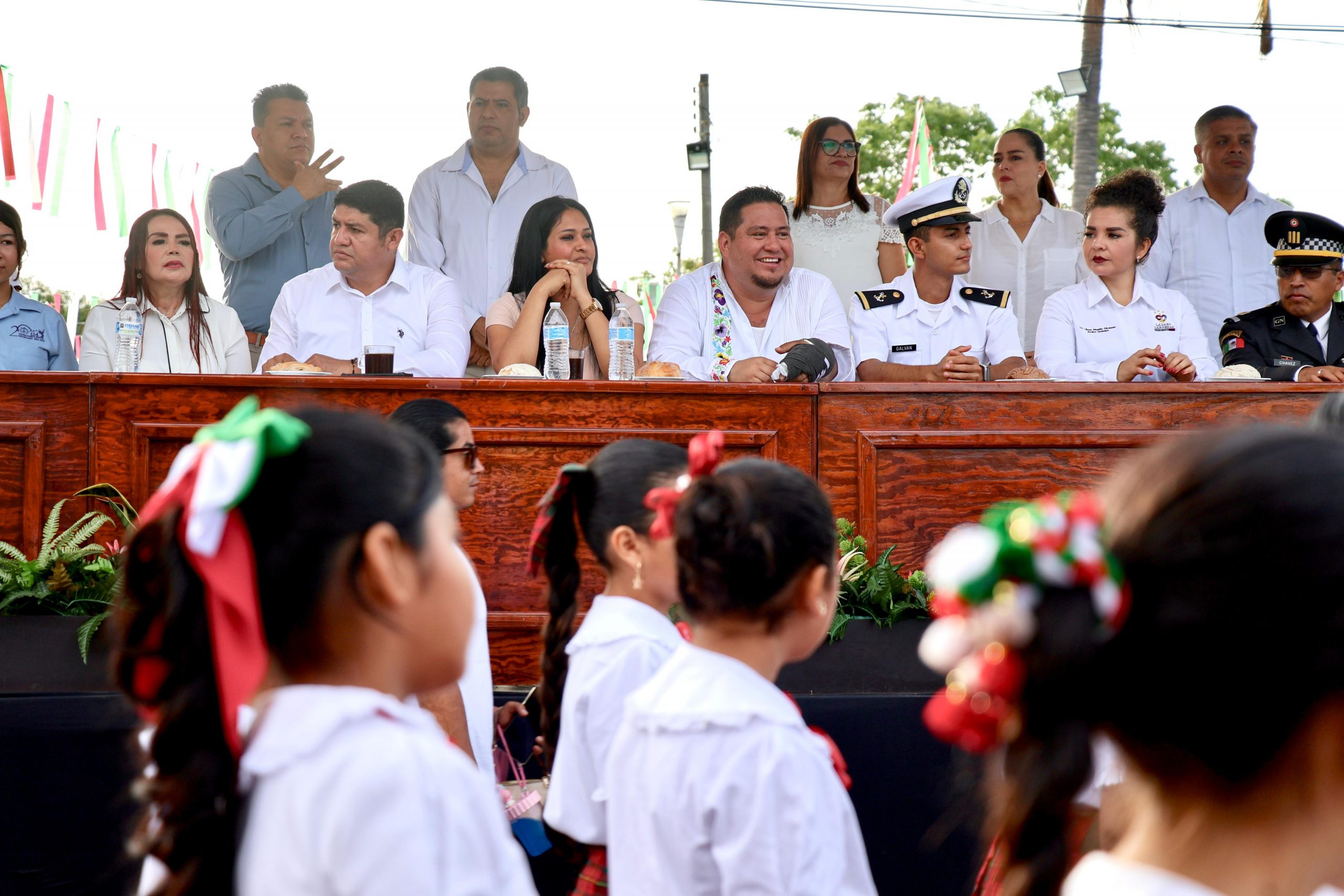 En punto de las 8 de la mañana, el Desfile dio arranque con la participación de la banda de guerra del Colegio Lumen de la tenencia La Mira, para después dar paso a los diferentes contingentes, siendo el primero de ellos encabezado por el Presidente Municipal, Manuel Esquivel Bejarano y funcionarios municipales.