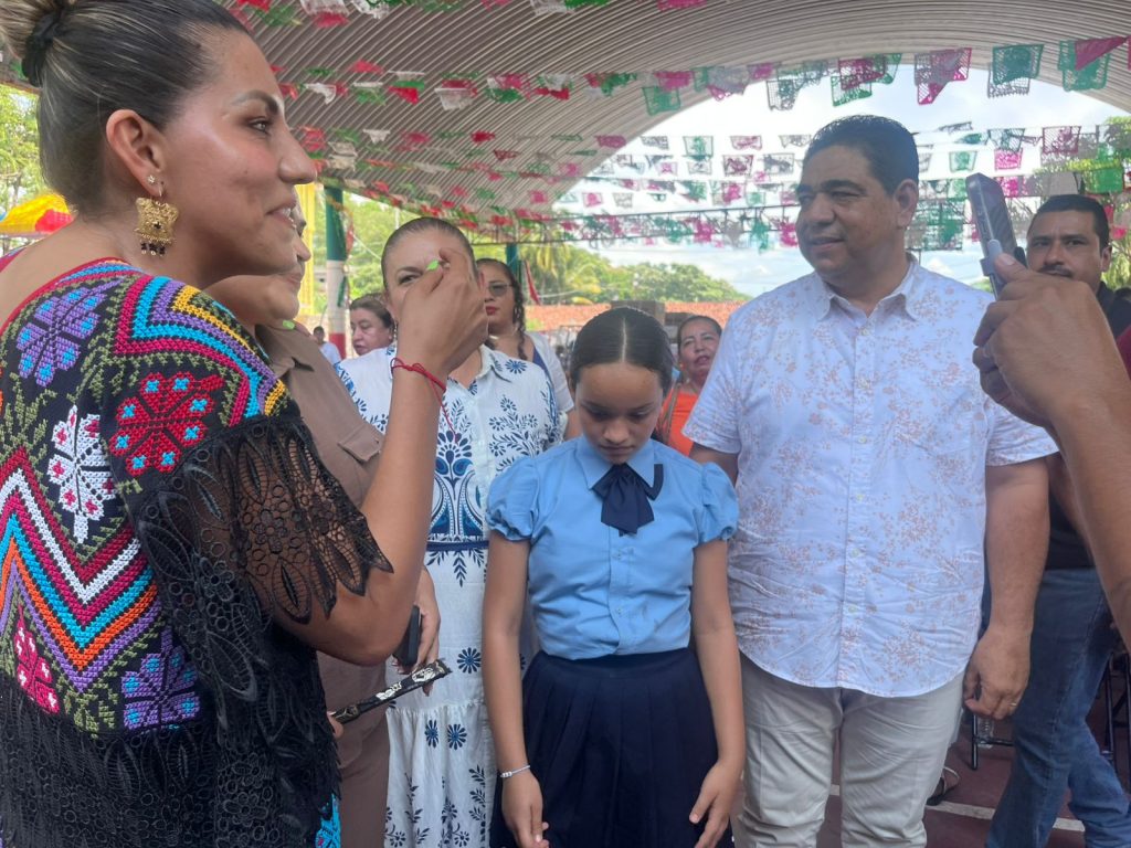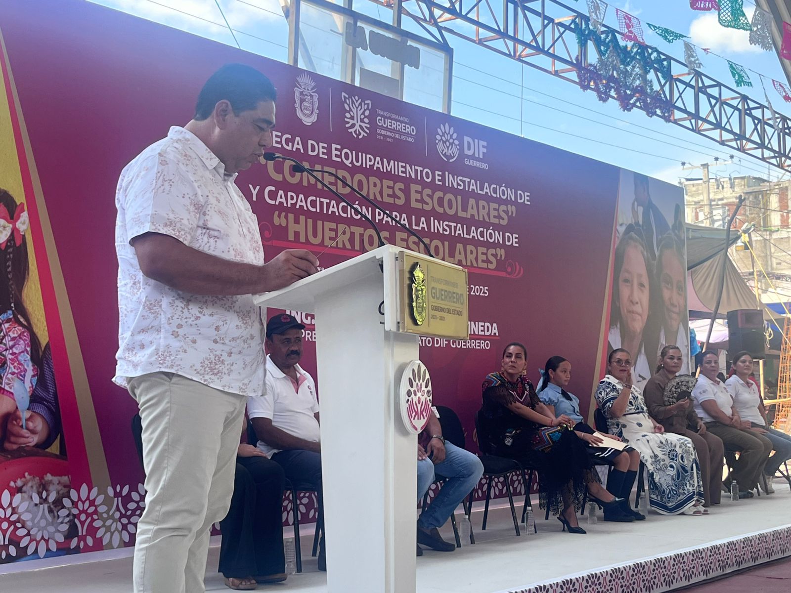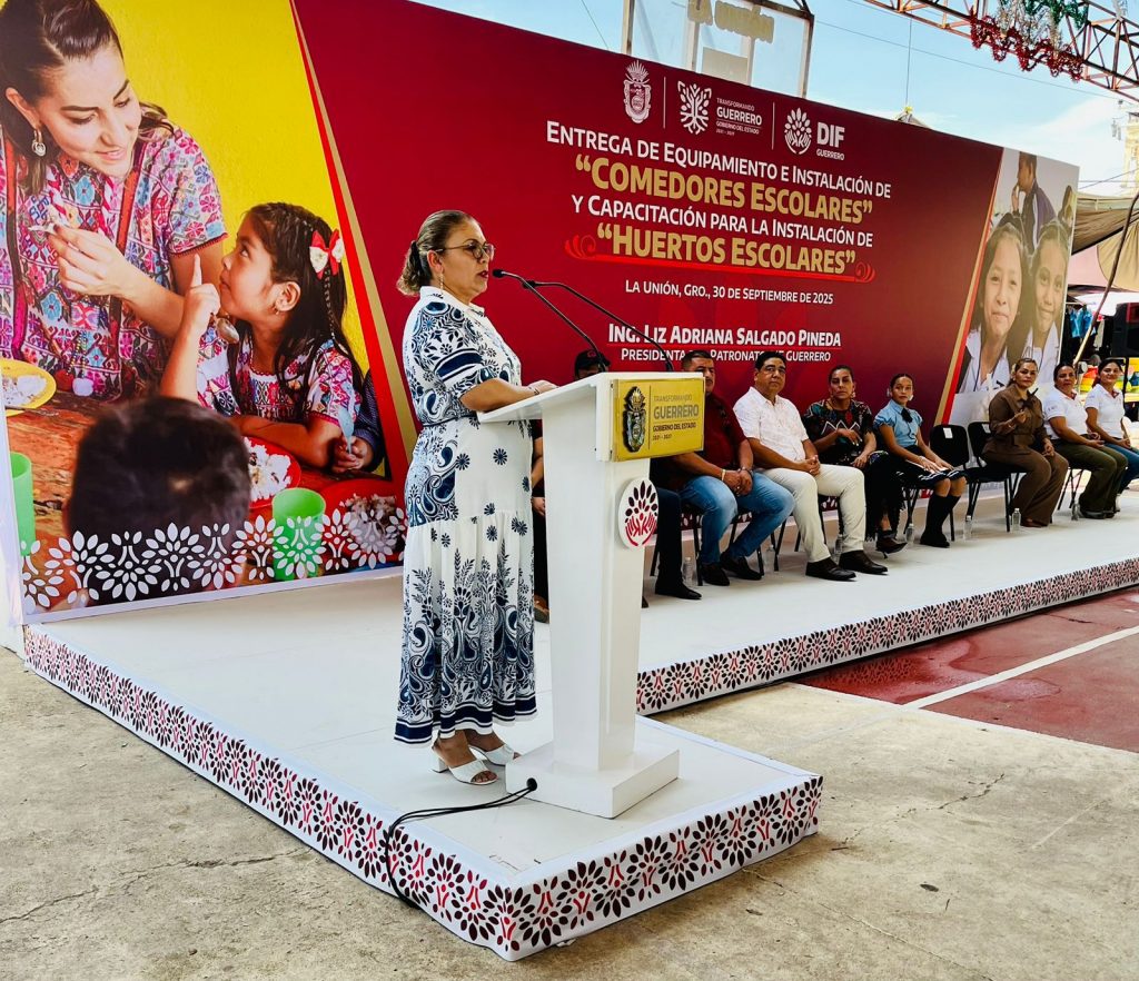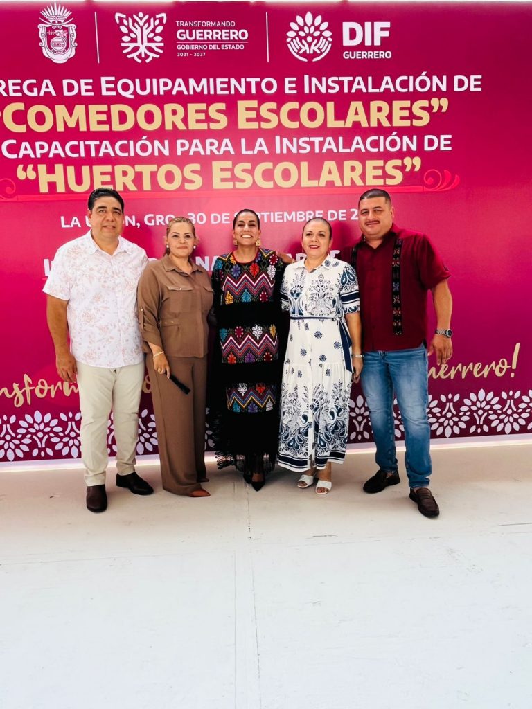 La Unión, Guerrero, 01 de octubre de 2025.- El presidente municipal, profesor José Francisco Suazo Espino, junto con la presidenta honoraria del DIF municipal, maestra Reyna Baldovinos Ochoa e integrantes de cabildo, reciben con agrado a la presidenta del DIF Estatal, Liz Adriana Salgado Pineda donde entregaron equipamiento e instalación para comedores escolares, al igual para el municipio vecino de Coahuayutla.