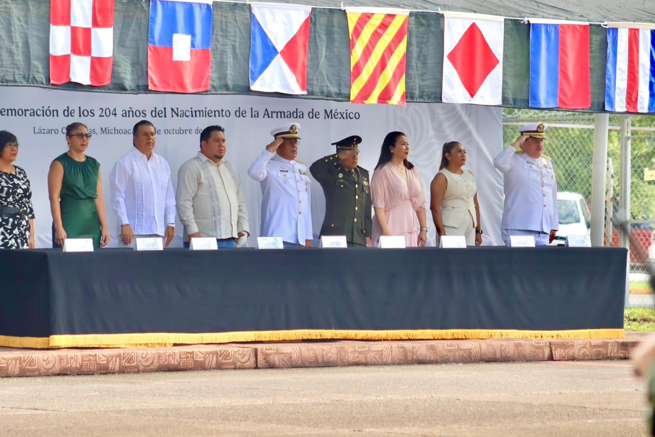 Cd. Lázaro Cárdenas, Mich., a 04 de Octubre del 2025.- Este sábado, el Presidente Municipal, Manuel Esquivel Bejarano acompañó a autoridades navales y militares a la ceremonia conmemorativa por el 204 años del Nacimiento de la Armada de México y 201 años de la Promulgación de la Constitución Federal de los Estados Unidos Mexicanos de 1824; evento que tuvo lugar en las instalaciones de la Décima Sexta Zona Naval.
