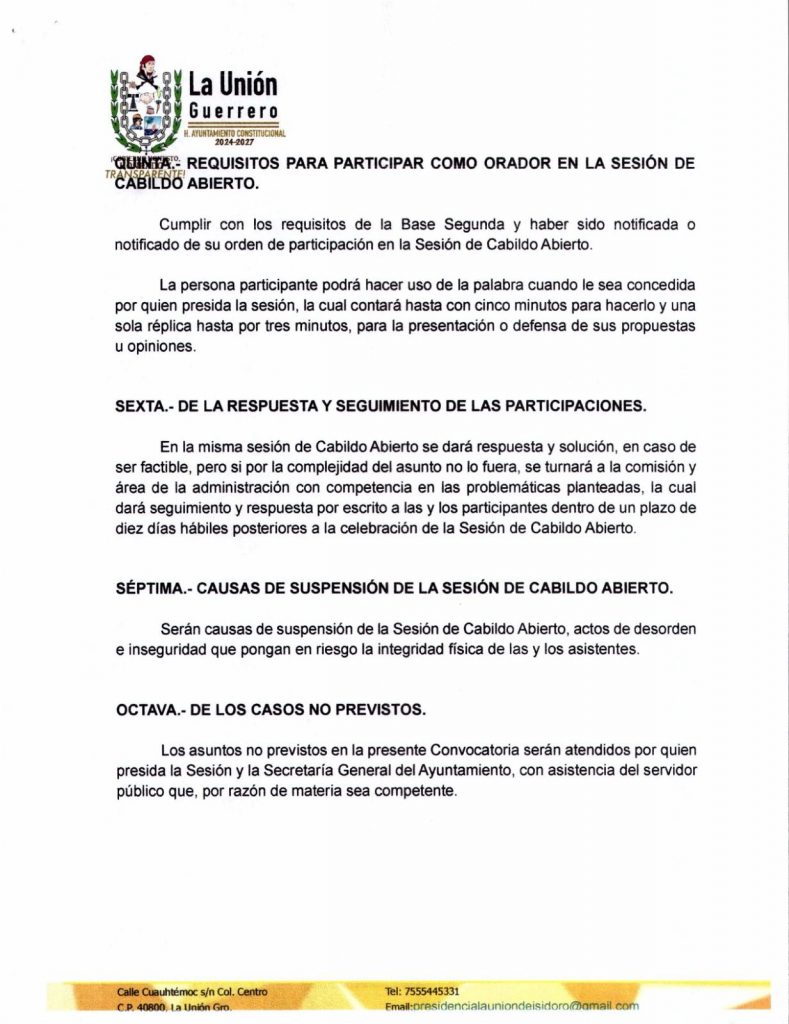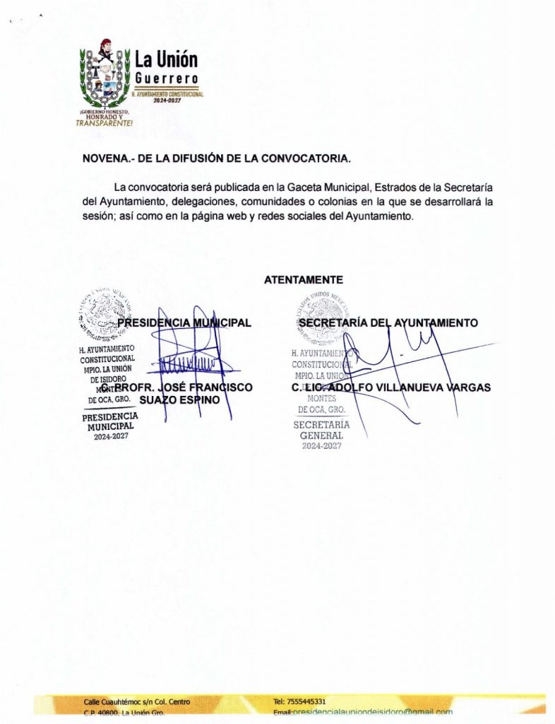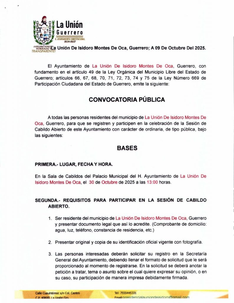 La Unión, Gro. 17 octubre 2025.- El presidente municipal, José Francisco Suazo Espino convoca a toda la ciudadanía a participar en la Sesión de Cabildo Abierta, que se realizará el próximo 30 de octubre a la 1:00 de la tarde, en la Sala de Cabildo del Palacio Municipal.