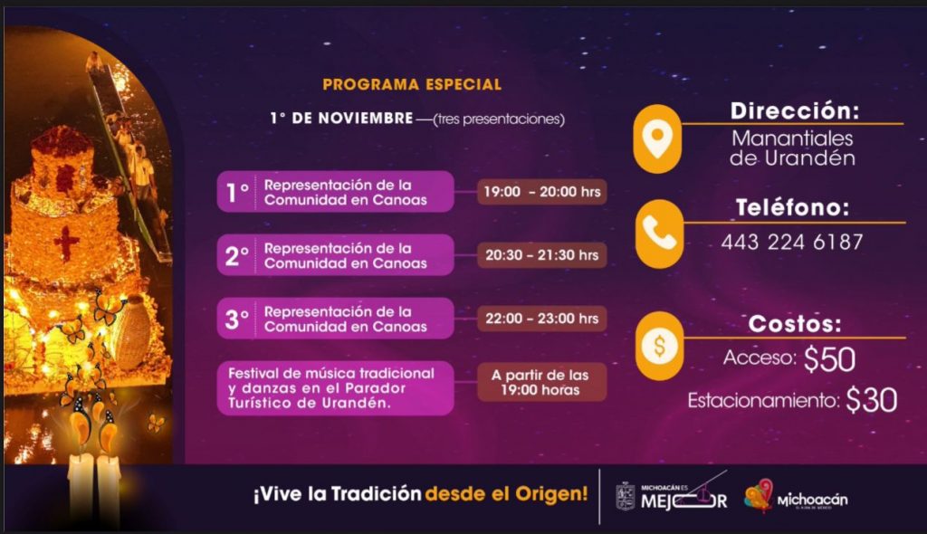 El titular de la política turística estatal recordó que el 1 de noviembre también se desarrollará el Festival de Música Tradicional y Danzas en el parador turístico de Urandén, desde las 19:00 horas. El costo de ingreso es de 50 pesos, y el estacionamiento en 30 pesos, cantidades que se quedarán en su totalidad para la comunidad. Para mayores detalles la Sectur puso a disposición el teléfono 443 224 6187, o bien, a través del sitio web https://visitmichoacan.com.mx/