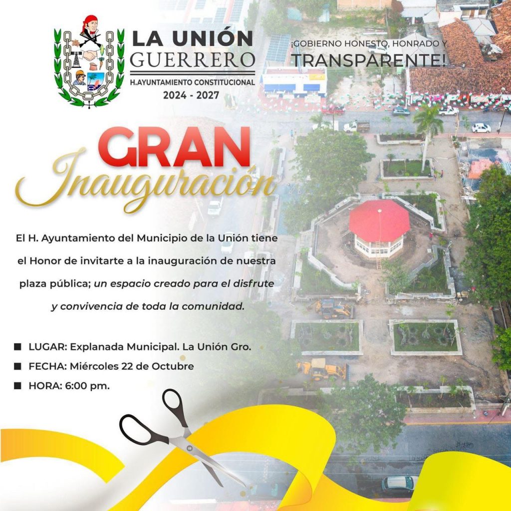 La Unión, Gro., 21 de octubre de 2025. — El presidente municipal, José Francisco Suazo Espino, invita a la ciudadanía en general a participar al gran evento de inauguración de la nueva Plaza Municipal que se ubicada en la cabecera, será mañana miércoles a las 18 horas es la cita.