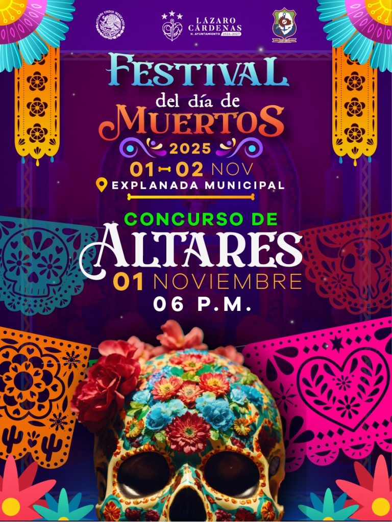 Cd. Lázaro Cárdenas, Mich, a 21 de octubre de 2025.– El Gobierno Municipal de Lázaro Cárdenas invita a participar en el Concurso de Altares que se llevará a cabo el próximo 1 de noviembre a las 6:00 de la tarde, como parte del Festival del Día de Muertos 2025, a celebrarse los días 1 y 2 de noviembre en la Explanada Municipal.