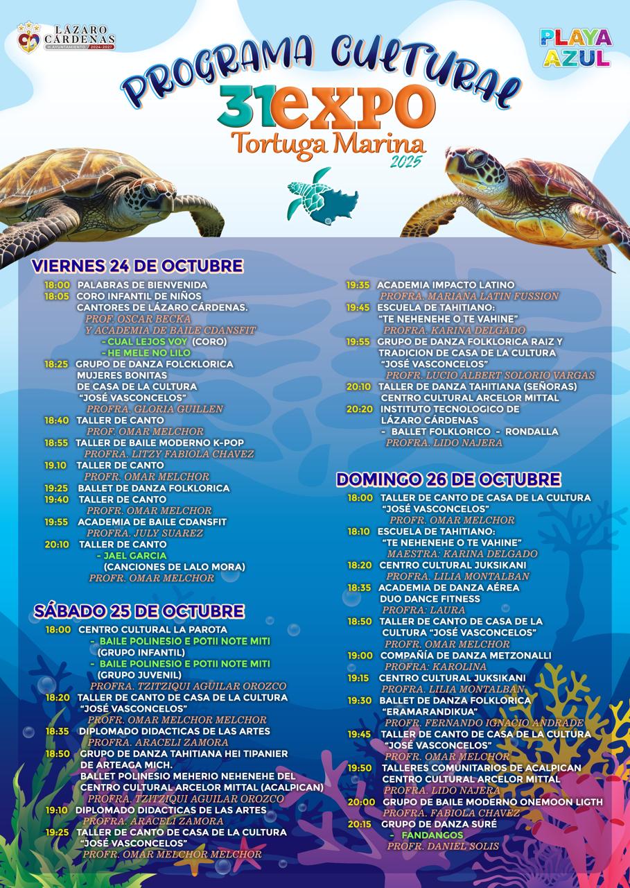 Cd. Lázaro Cárdenas, Mich., a 23 de Octubre del 2025.- Como cada año, la Expo Tortuga Marina 2025 tiene preparado un amplio programa artístico-cultural en el que se exhibirá danza, música y canto; por lo que el Gobierno Municipal hace la invitación a la población en general a no perderse de este evento el próximo 24, 25 y 26 de octubre en la Tenencia de Playa Azul.