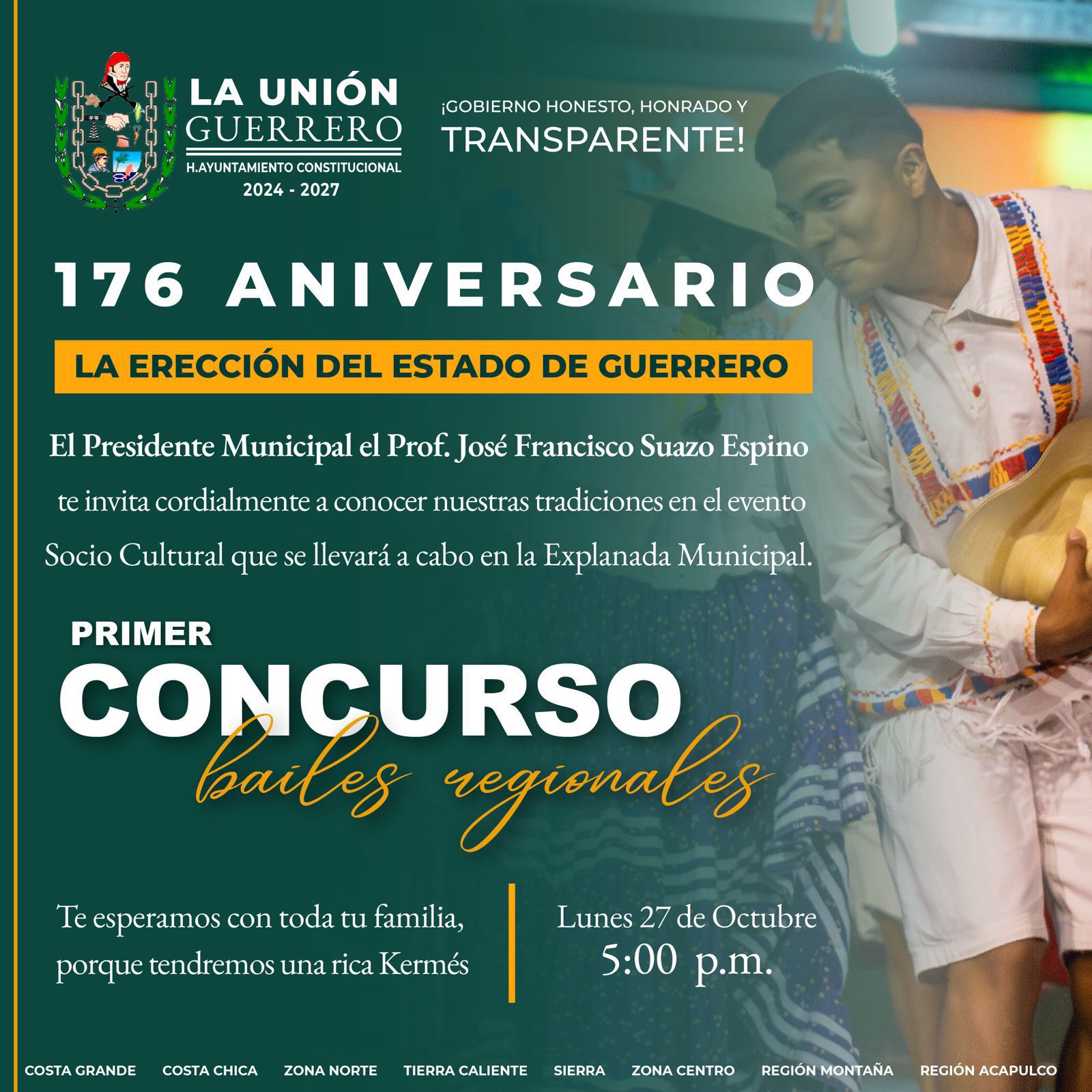 La Unión, Gro., 24 de octubre. — El presidente municipal, profesor José Francisco Suazo Espino, convoca a toda la ciudadanía a participar al evento conmemorativo por la Erección del Estado de Guerrero, que se llevará a cabo el próximo lunes 27 de octubre a partir de las 5:00 de la tarde en la explanada municipal.