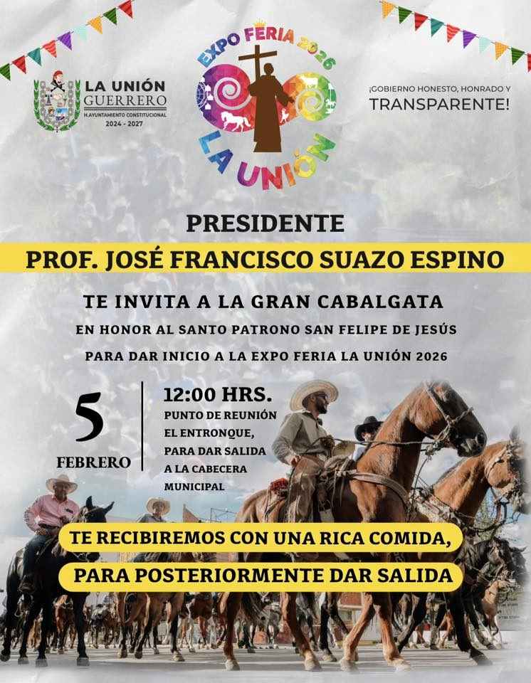 La Unión, Guerrero. 04 de febrero de 2026.- El presidente municipal José Francisco Suazo Espino, le invita a la gran fiesta del pueblo en honor a San Felipe de Jesús, La Expo Feria 2026 que iniciará mañana con grandes eventos campiranos, desfile de carros alegóricos y el corte de listón.