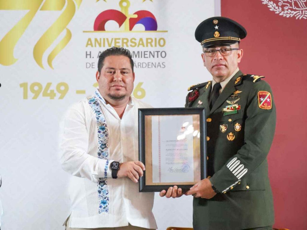 Cd. Lázaro Cárdenas, Mich., a 16 de Marzo del 2026.- Este lunes 16 de marzo se conmemoró el 77º aniversario de la instalación del primer Ayuntamiento del municipio Melchor Ocampo del Balsas hoy Lázaro Cárdenas; por lo que autoridades municipales encabezaron una sesión solemne en el teatro del pueblo de la Expo Fiesta LZC 2026; una ceremonia en que el Presidente Manuel Esquivel Bejarano, hizo entrega de un reconocimiento al Ejército Mexicano, como muestra del agradecimiento y respeto del pueblo de Lázaro Cárdenas por su dedicación, disciplina y compromiso.
