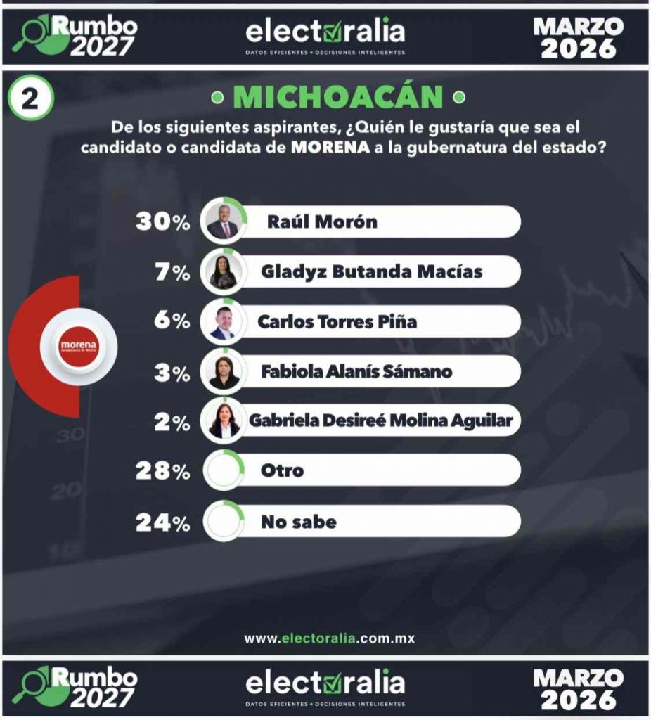 Con un contundente 30% de las preferencias, el senador Raúl Morón Orozco se despega de sus competidores y se consolida como el virtual candidato de Morena a la gubernatura para 2027, al marcar distancia de perfiles como Gladyz Butanda y Carlos Torres Piña, quienes apenas alcanzan el 7% y 6% respectivamente, lo que confirma que el legislador es la figura con mayor arrastre y capacidad de unidad dentro del movimiento de la Cuarta Transformación en la entidad.