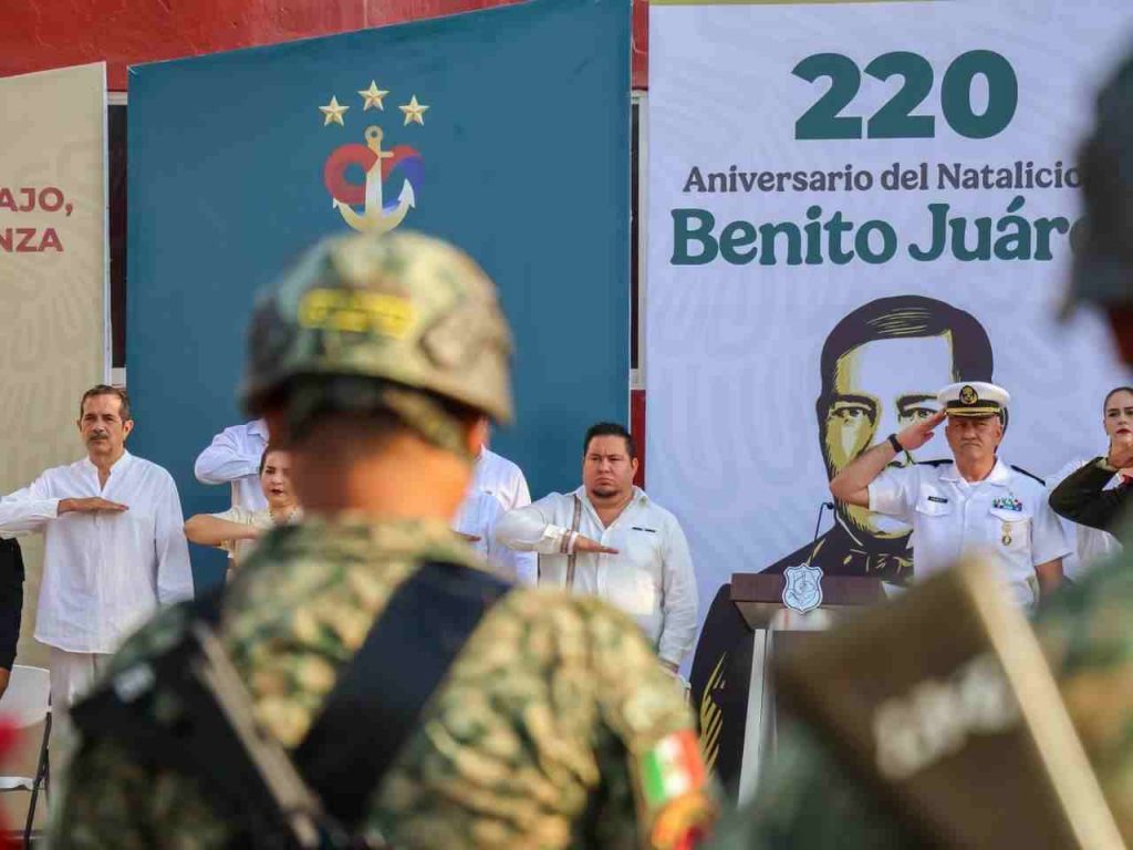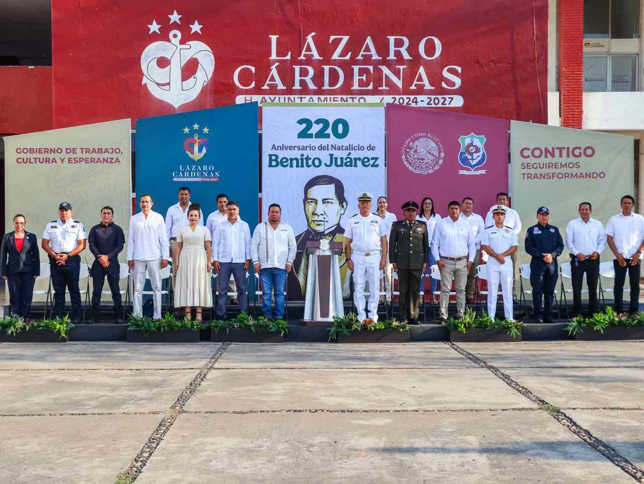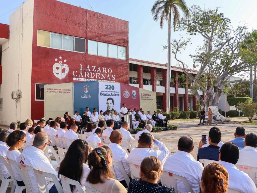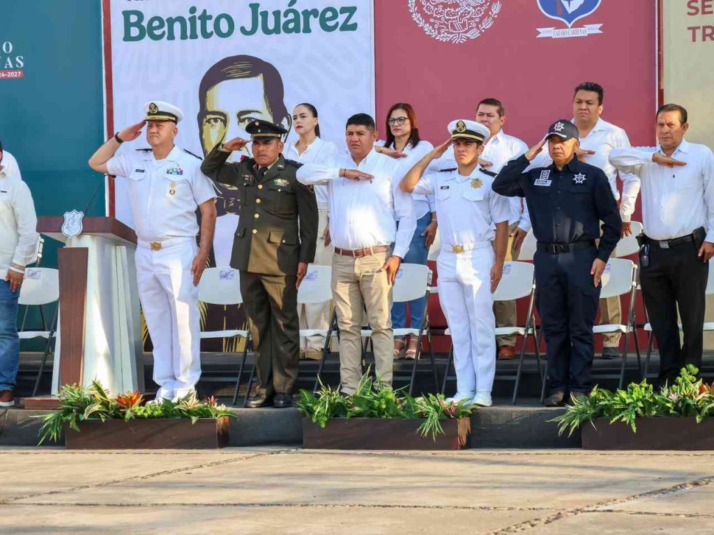 Cd. Lázaro Cárdenas, Mich. A 21 de Marzo del 2026.- Este sábado se conmemoró el 220º aniversario del natalicio del Benito Juárez; por lo que autoridades navales, militares y municipales encabezaron una ceremonia cívica en la explanada municipal, para recordar el legado y vida del “Benemérito de las Americas”; acto que fue presidido por el Presidente Municipal, Manuel Esquivel Bejarano.